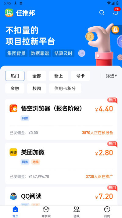 任推邦app是BD邦自营APP一款推广管理工具,简单来说就是给各个app推广新用户,它集合了APP项目分发、数据统计、团队裂变、团队管理、佣金发放等功能,目前有20万+推广渠道注册使用,是百度极速版、夸克、UC、悟空浏览器等项目的一级服务商。任推邦助力全国各地大中小型的地推团队解决数据统计、结算稳定、价格优势等问题,致力于帮助更多的地推团队更好的实现地推事业。如果你想要为自己的产品做推广,你可以在这里发布地推项目,之后就会有用户帮你进行地推,如果你想多一份收入,也可以来下载任推邦,只需在平台上接单完成任务即可获得相应回报,并且所赚取的所有收益都是可以提现的。