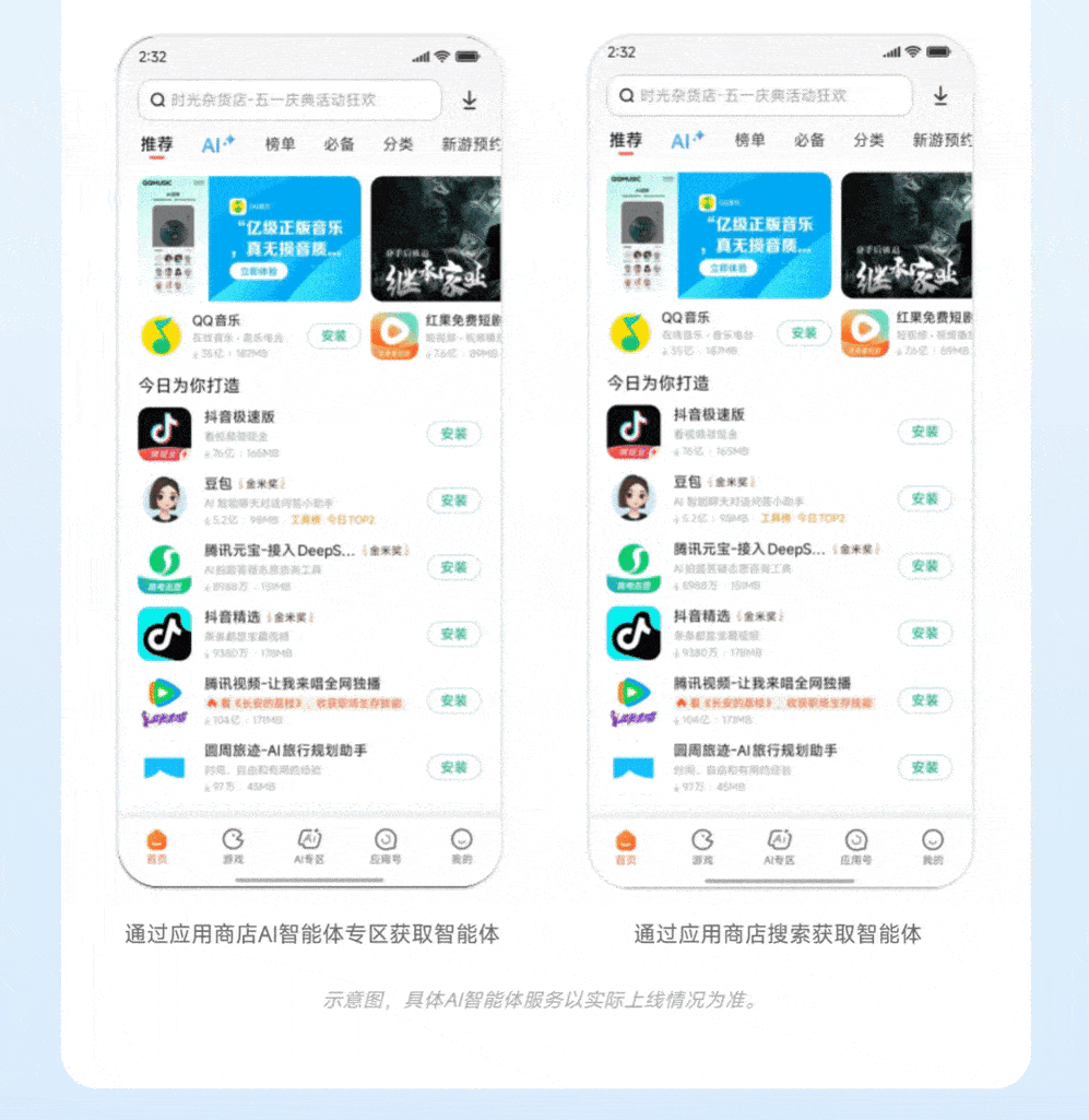 用户只需在小米应用市场APP内点击底部【智能体】,即可进入AI智能体专区,浏览并使用各类实用、有趣的A智能体产品;此外,用户还可通过应用商店搜索功能,便捷查找并获取智能体服务。整个流程无需下载,即开即用。