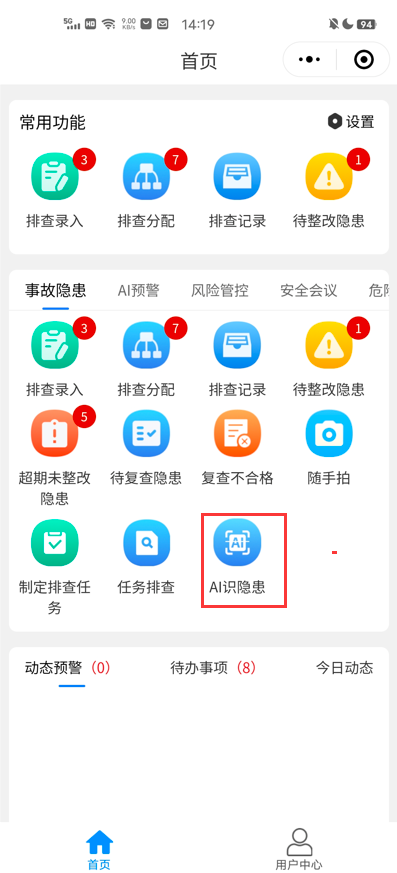 5、进入AI+双控系统的首页,点击【AI识隐患】。