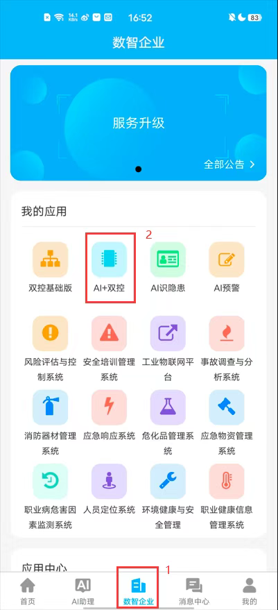 4、点击底部导航栏【数智企业】,进入应用中心,点击【AI+双控】跳转到AI+双控系统。