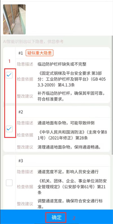 7、识别完成后,AI会给出参考的隐患信息,查看后勾选符合实际情况的隐患,点击【确定】即可。