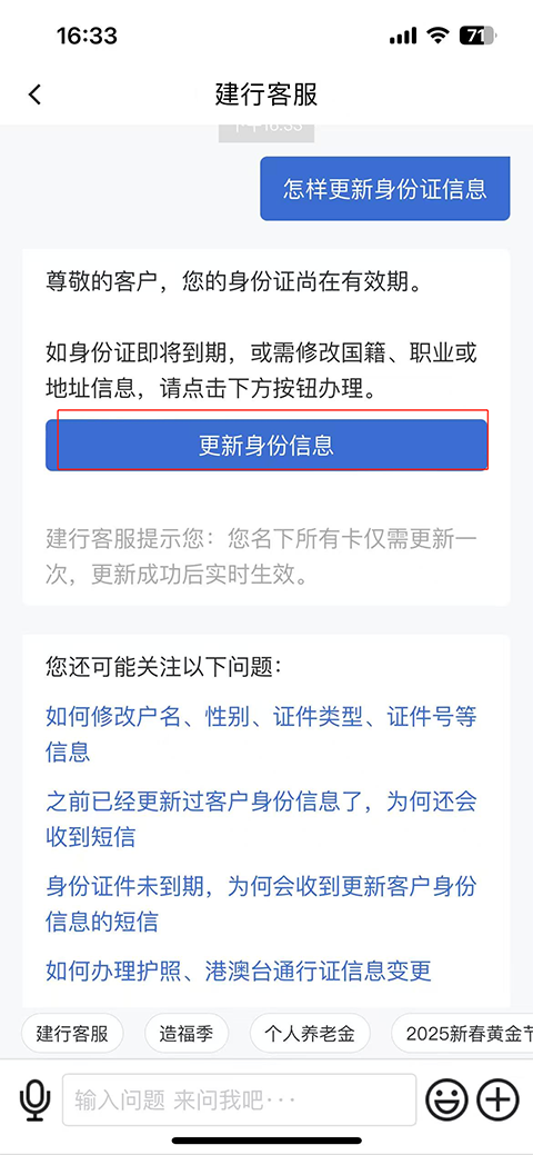 2、输入框输入:怎样更新身份证信息。点击机器人回复的【更新身份信息】。