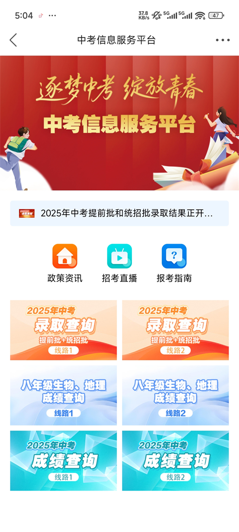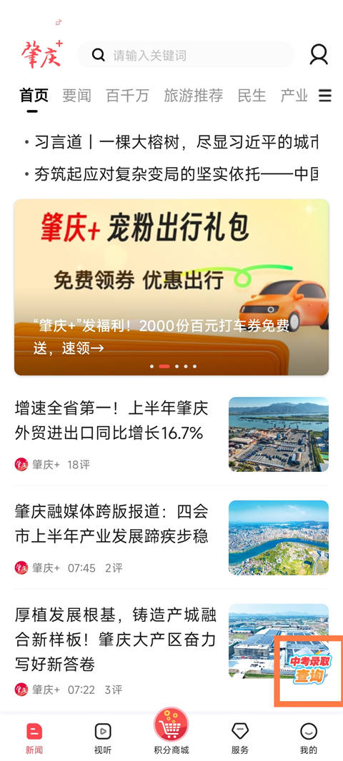 1、打开肇庆+手机客户端,在主界面找到【中考领取查询】或者在服务板块