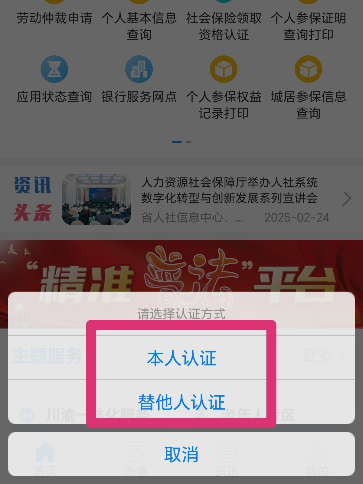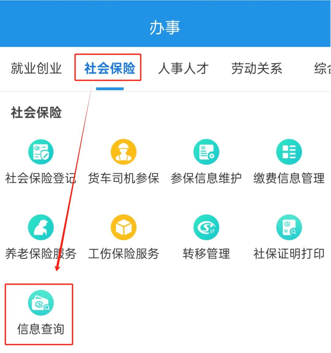 进入“四川人社”APP首页,下滑页面找到以下板块,办事→社会保险→信息查询