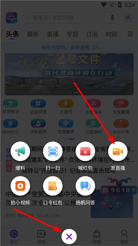 1、打开扬帆App,登录进入首页,用户可在首页查看扬州新闻、社区志愿服务、生活服务等,点击“+”,选择发直播;