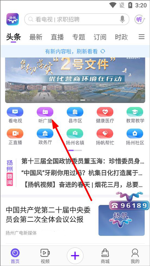 1、打开扬帆App,登录进入首页,用户在首页看电视、了解头条新闻、直播新闻、专题阅读等,点击听广播;