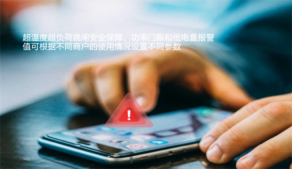 超温度超负荷跳闸安全保障,功率门限和低电量报警值可根据不同商户的使用情况设置不同参数。
