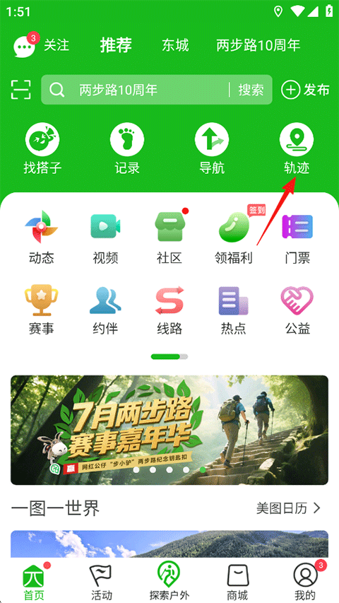 1、打开两步路助手,在首页点击轨迹;