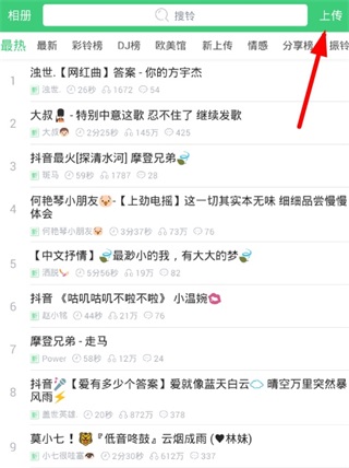 1、首先是打开手机里的铃声多多APP,点击首页里右上角的【上传】: