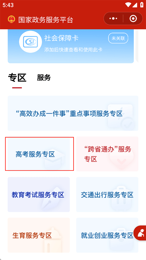 3、跳转到微信小程序国家政务服务平台后在下方找到高考服务专区;