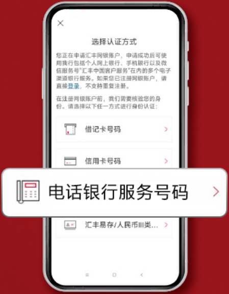 4、注册网银账户前,我们需要核验身份。请您在“认证方式”页面,选择“电话银行服务号码”