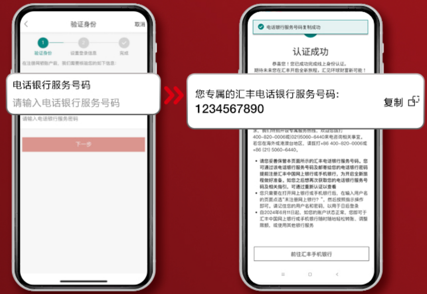 5、在“验证身份”页面,输入电话银行服务号码。在您完成线上身份认证后,我行将为您注册电话银行服务,并在“认证成功”页面提供汇丰中国电话银行服务号码