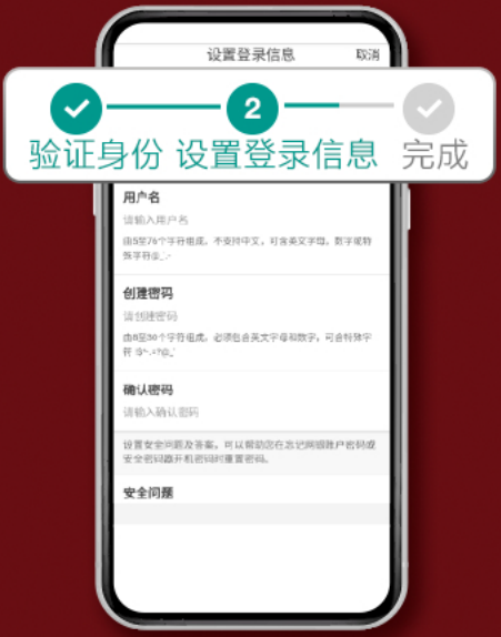(1)设置登录信息:包括用户名、网上银行登录密码和设置安全问题及答案,此项信息非常重要,可以帮助您在忘记网上银行登录密码或手机银行设备密码时重置密码。