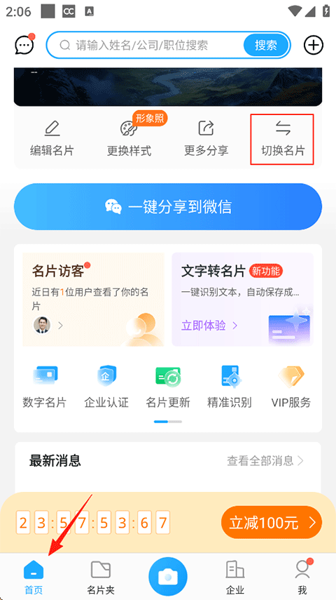 1、打开名片全能王手机版,在首页点击切换名片功能;