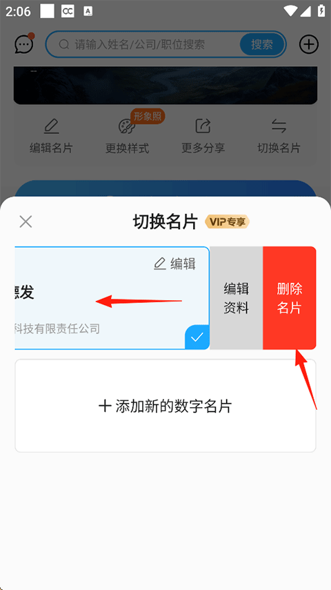 2、将需要删除的名片向左滑动,接着点击删除名片即可;