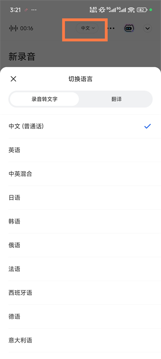1、打开软件点击右下方麦克风按钮后,可切换语种及内外录功能