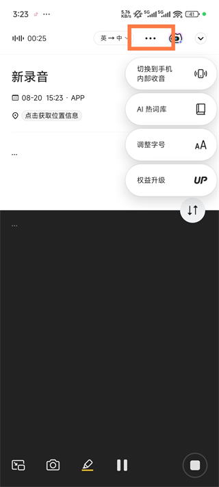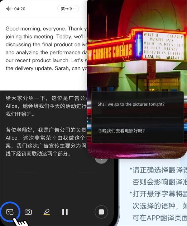 打开软件点击右下方麦克风按钮后确定语种及内外录无误后,点击悬浮字幕图标