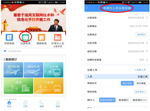 登录APP首页选择“出差申请”按钮,进入“本单位人员出差申请”页面。