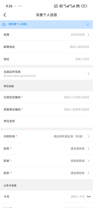 请从单位管理员或财务人员处获取单位的行政区划编码(6位数字)和预算单位编码(6位数字),在APP完善个人信息页面分别填入【行政区划编码】和【预算单位编码】栏目,系统将自动匹配并列出您的单位。