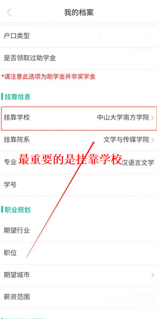 注意:请正确填写挂靠信息栏,挂靠学校(中山大学南方学院),如填写错误,回台工作人员将无法找到挂靠信息通过审核。