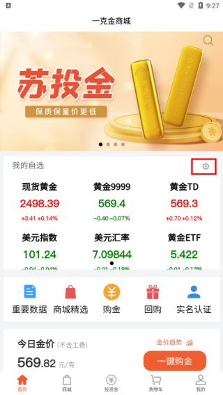1、进入一克金App首页,找到我的自选板块中的设置图标;