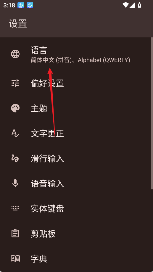 3、进入键盘设置界面,点击顶部的【语言】;