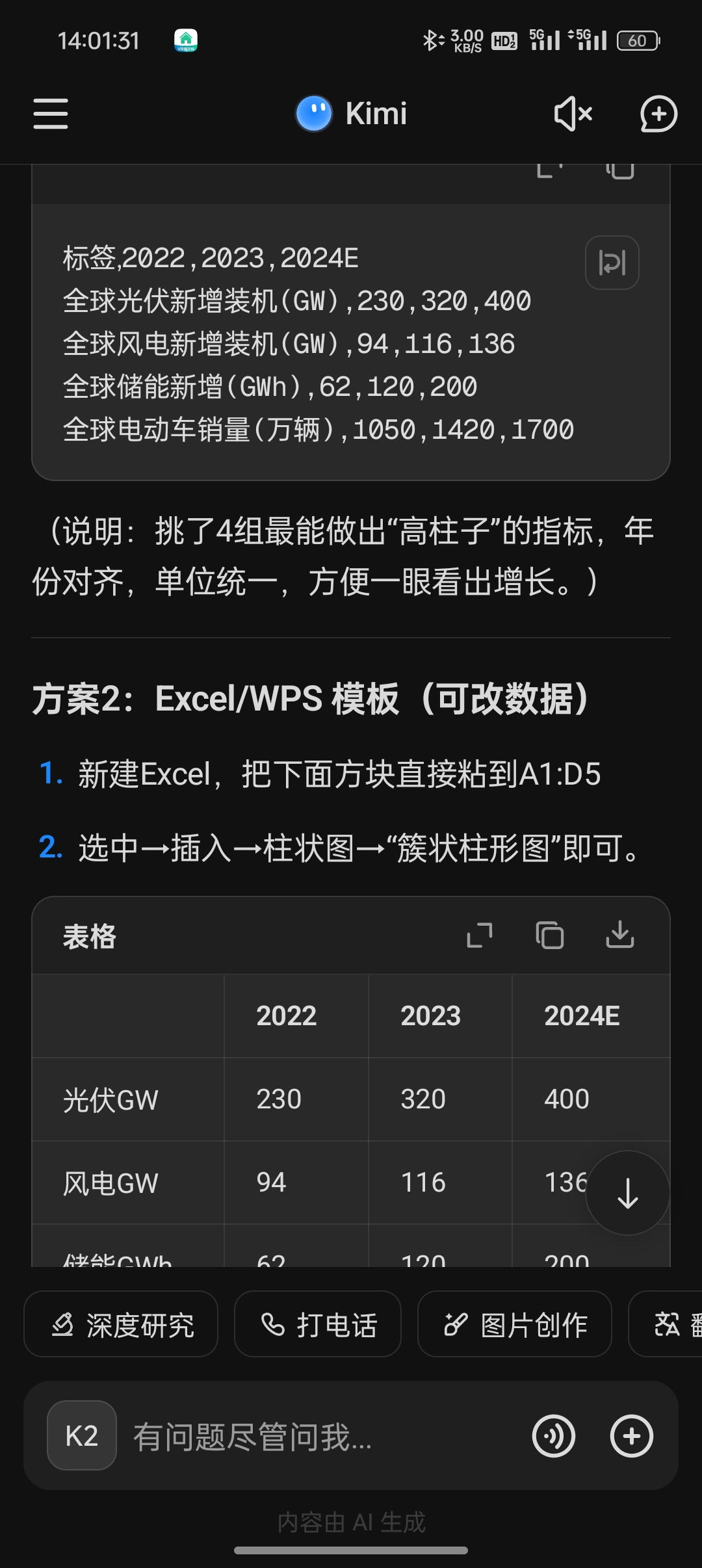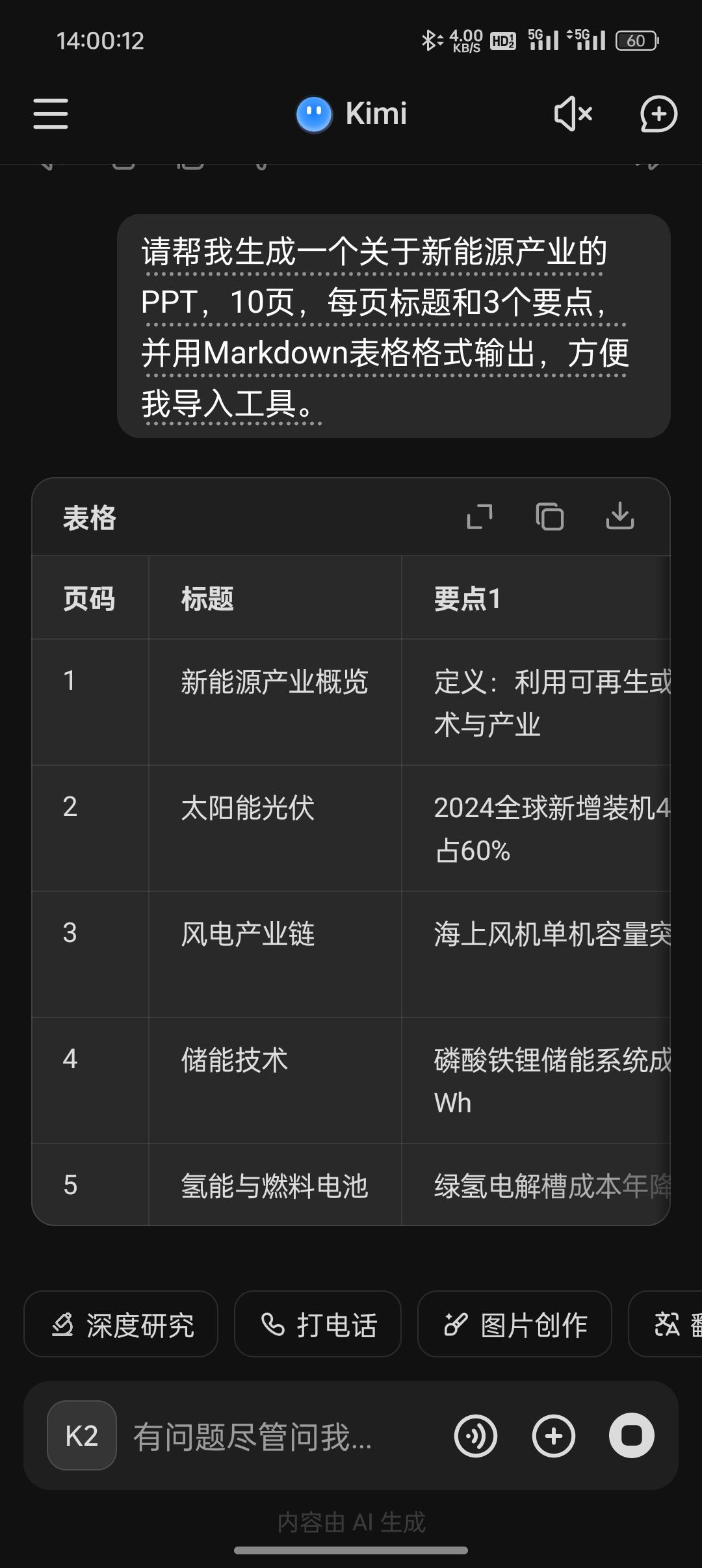 比如输入:请帮我生成一个关于新能源产业的PPT,10页,每页标题和3个要点,并用Markdown表格格式输出,方便我导入工具。