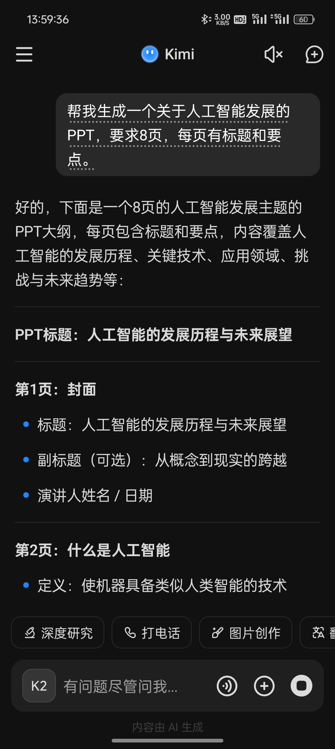 Kimi会快速给出每一页的标题和要点内容,甚至会标注哪些地方适合放图表或配图。