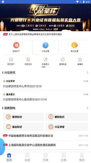 兴证期货app是由兴证期货有限公司精心打造的新一代期货交易软件,对界面操作进行了特别的优化,保证客户操作的流畅度,并可以自主配置界面,内有详细的期货投资知识与行情,带你轻松掌握市场,第一时间了解最新的行情动态内容。不仅如此,该软件集期货云开户、业务办理、资讯、期货期权行情、交易等功能模块于一体,让用户可以在手机端轻松进行期货账户的开户、办理业务及交易,也让每一位投资者都能享受安全、便捷、快速的期货投资服务。在这里,全方位的财经要闻,期市资讯,助您掘金期海,把握投资良机,让您轻轻松松赚钱,享受到更多的收益。需要的朋友欢迎下载使用。