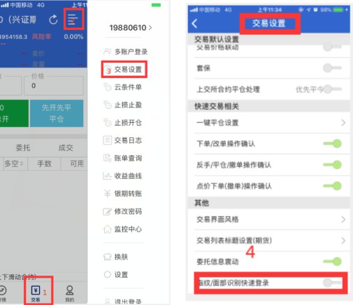 1、在交易-主菜单-交易设置-其他-指纹/面部识别快捷登录;