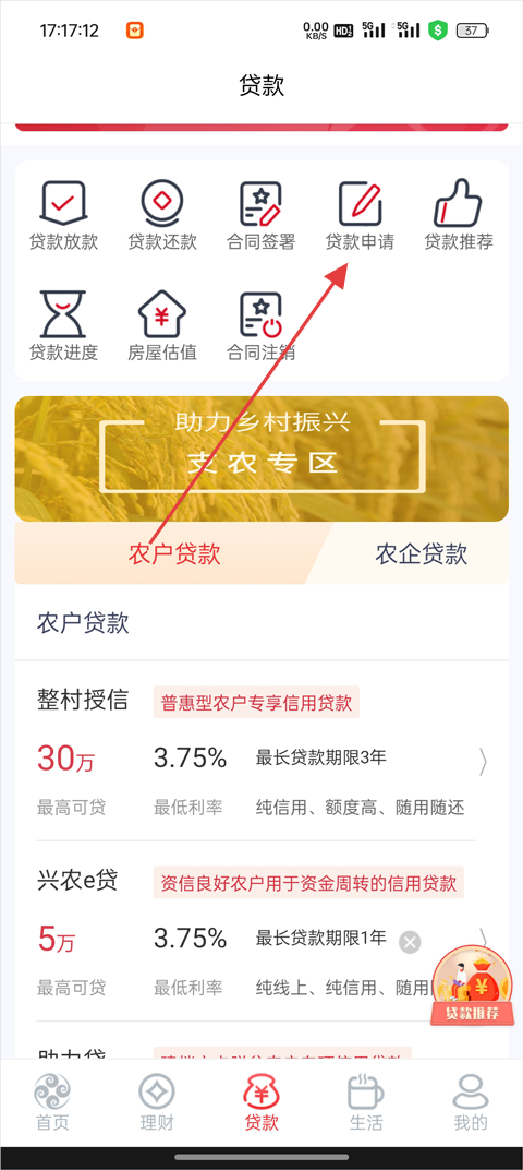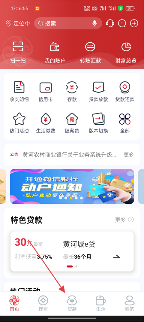1、打开黄河银行App,进入首页后点击底部导航栏中的【贷款】功能入口。