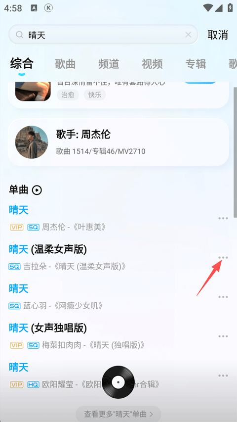 1、在搜索栏搜索想要设铃声的歌曲并点击右侧的【...】扩展按钮;