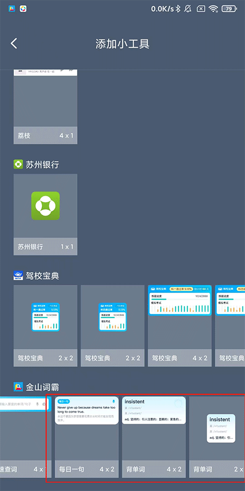 2、滑动到【金山词霸】小工具,选择小工具的样式,点击即可添加到桌面;