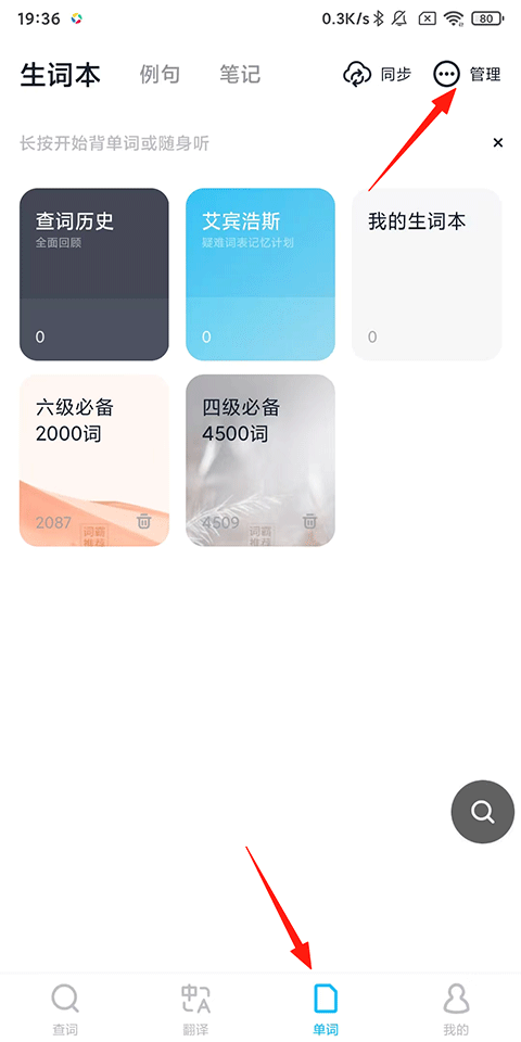 1、打开金山词霸APP,点击【单词】-【管理】;