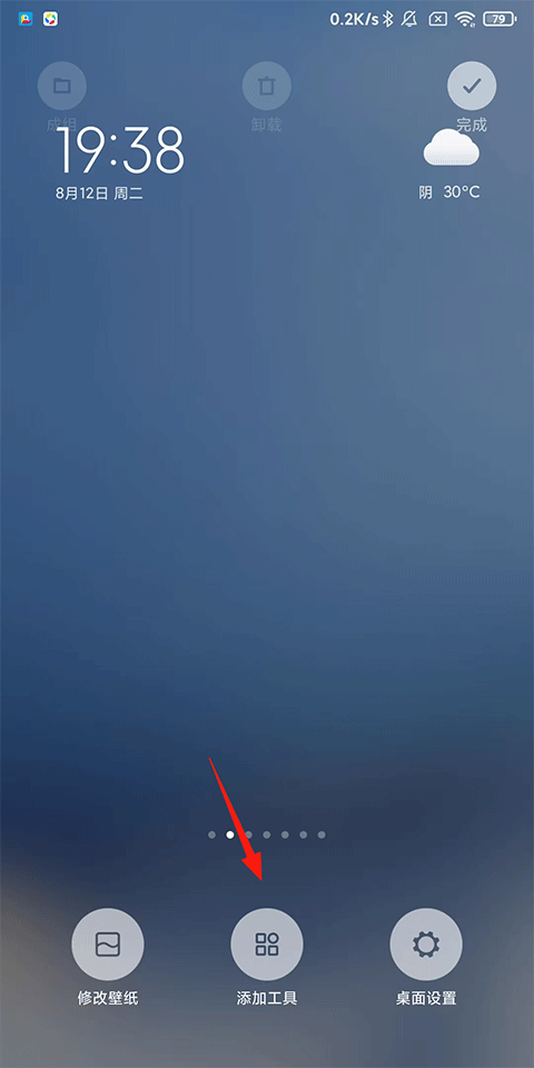 1、长按手机屏幕空白位置,在弹出的功能列表中点击【添加工具】;