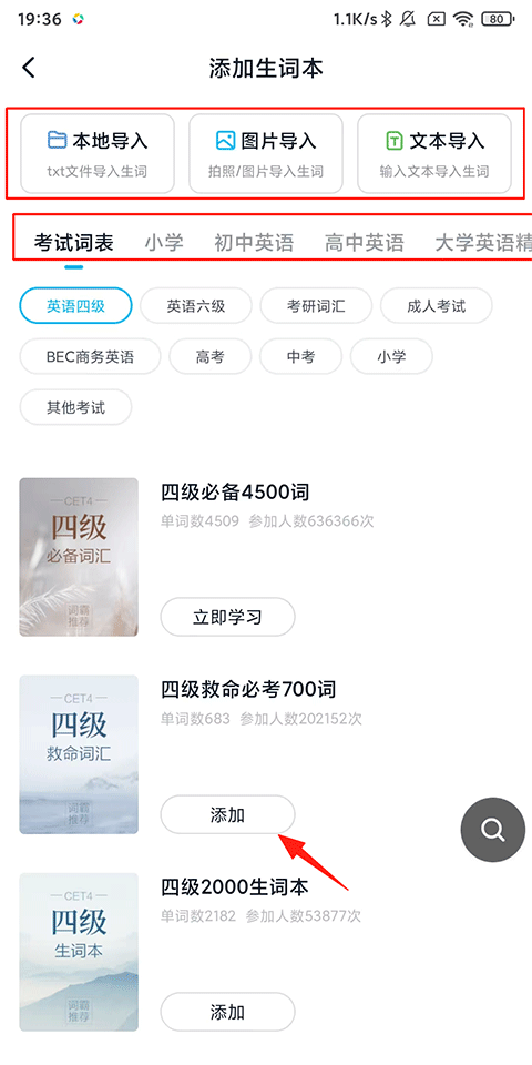 3、可选择本地导入、图片导入、文本导入以及下方系统提供的单词本,点击【添加】按钮;