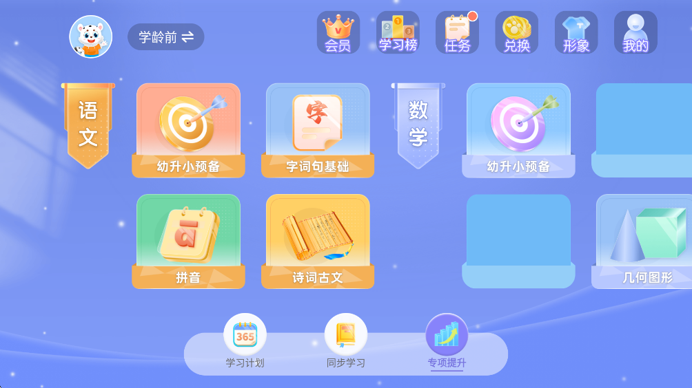 完成学习任务就获得学币,多种学具玩具等实体礼品与卡通形象、背景、皮肤装扮免费兑换,帮助学生养成良好学习习惯,让孩子有目标,有动力,爱上学习!