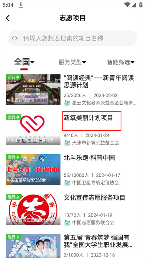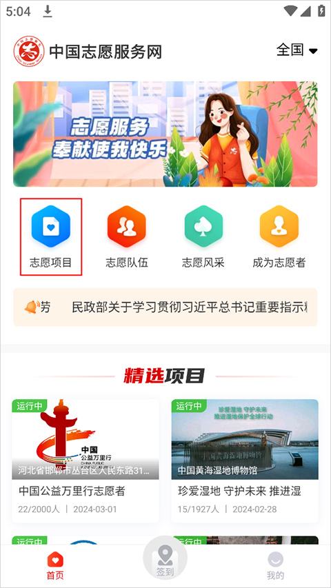 1、打开中国志愿服务网App,在首页点击 “志愿项目”;