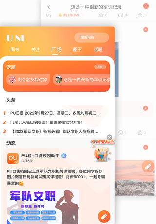 时事热点、高校头条、动态广场,在这里你可以结交到全国各大高校里志同道合的朋友。