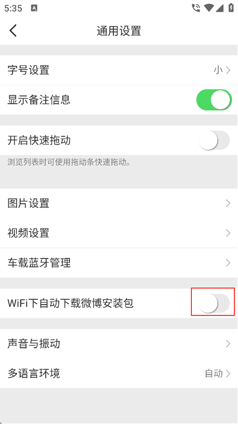 3、关闭“WiFi下自动下载微博安装包”即可。