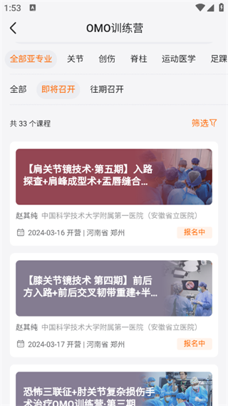 我们首先需要打开好医术app官方版,然后我们可以看到首页最上面的地方有一个【更多】,然后我们点击进入之后,你们就可以看到【OMO训练营】,然后这个地方一般的都是直接的实战训练营,也就是我们可以看到名师去主刀的内容,当然一般这样的课程都是很热门的,我们打开进去之后,一般都是【课程已招满】。