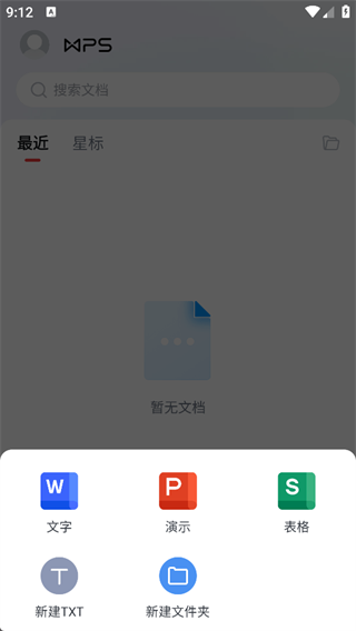 2、在弹出新建选项,可选择文字、演示、表格、TXT、文件夹等类型。