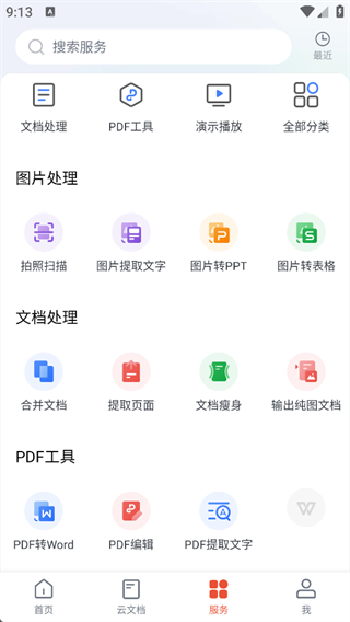 6、服务板块展示WPS Office Pro App的各种功能如:图片处理、文档处理、PDF 工具等核心功能模块。