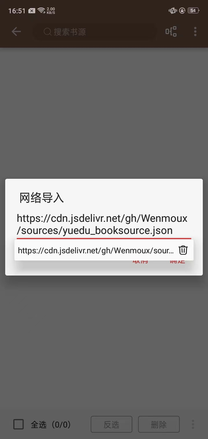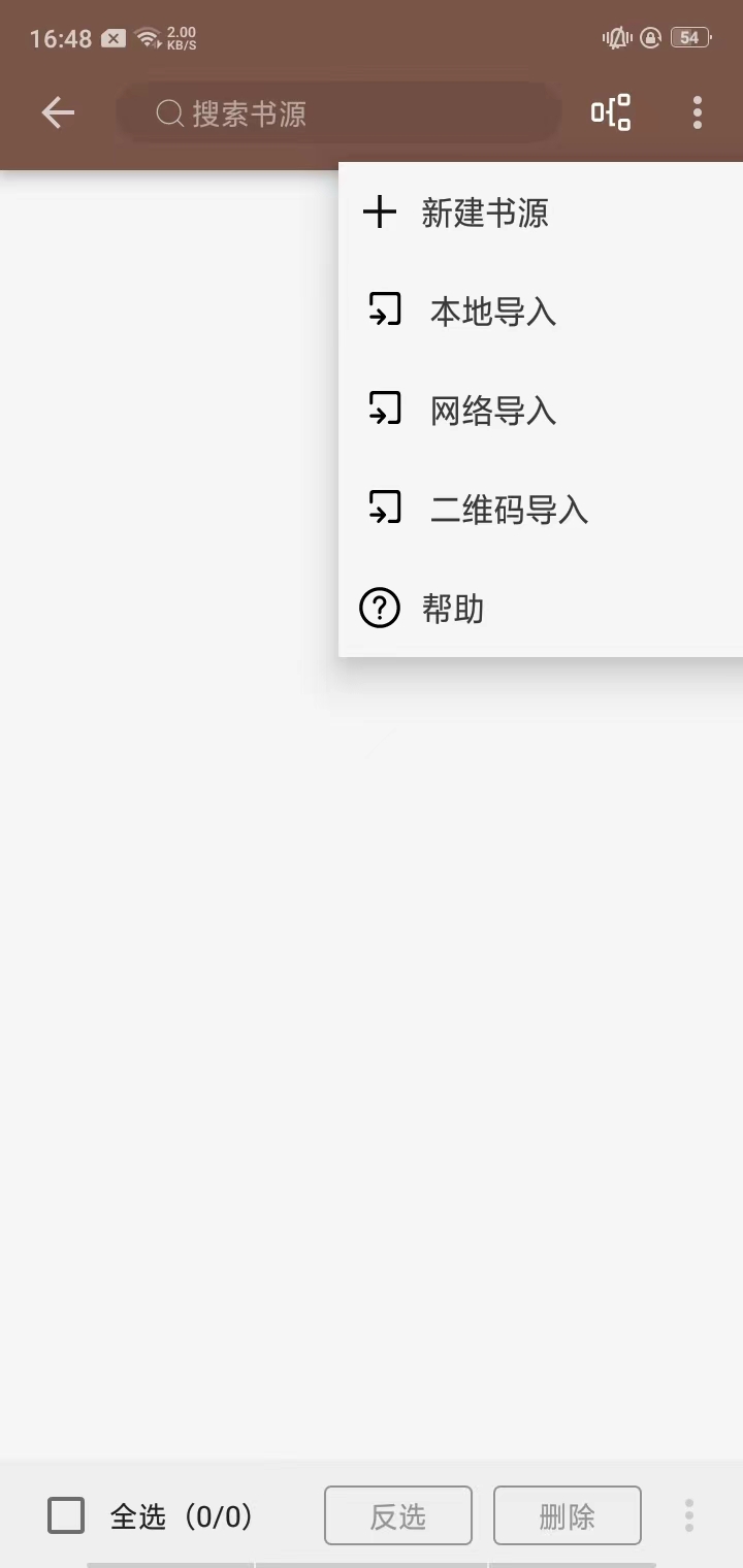 2、点击右上角的三个点,在这里,可以新建书源,也可以选择本地导入、网络导入、二维码导入,用户可以根据自身需求来选择;