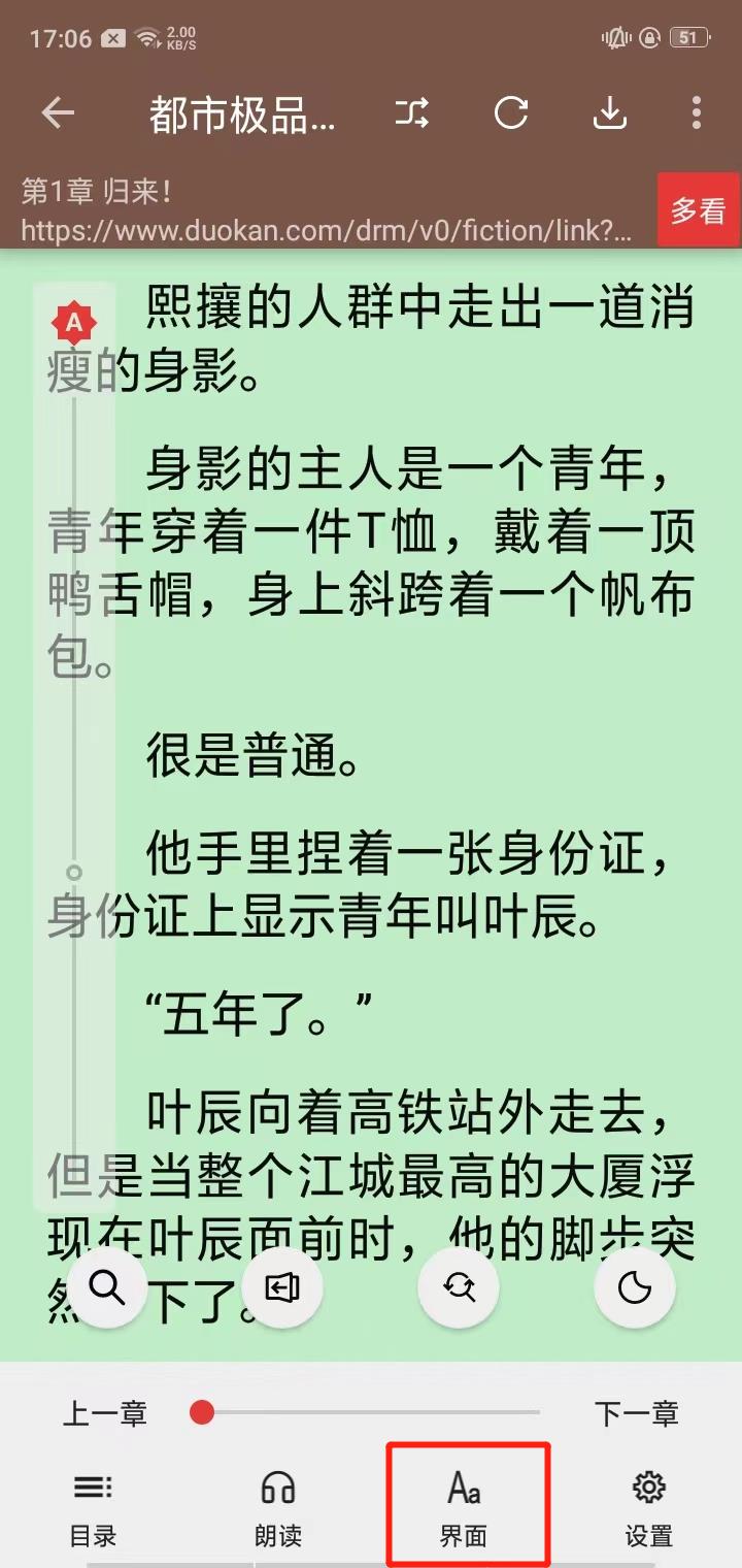 1、首先,我们随便打开一本小说,点击屏幕,会出现这个页面(注意:有时候点击一下可能会跳到第二页,但是没关系,多试几次,就会出现下图那个页面),然后点击下方导航栏中的【界面】;