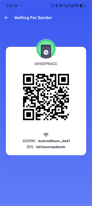 点击“接收”后,自动生成二维码+专属热点+密码,等待发送方连接。
