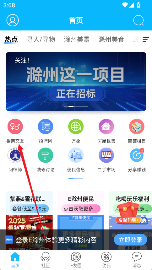 1、打开E滁州App后点击首页的「相亲交友」模块;
