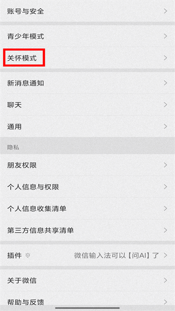 3、在设置框中,选择“关怀模式”;