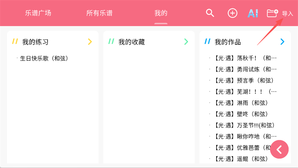 5、在【我的】页面,你可以查看自己已练习过或收藏过的乐谱。通过右上角的【导入】按钮,你还可以将外部乐谱导入到App中,进行个性化的练习和演奏。
