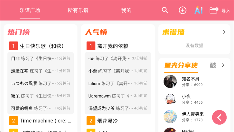 2、进入乐谱广场,是所有曲目的集中展示区。在这里,你可以通过【热门榜】和【人气榜】找到当前最受欢迎的乐谱。你也可以访问【求谱墙】,查看和获取你想要的乐谱资源。